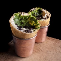 Dedicato all’amico Ciro Paone, fondatore dell’azienda di moda Kiton, grande eccellenza del Made in Italy. Un cono di pizza fritta con fonduta di grana padano, pesto di rucola e polvere di oliva caiazzana.