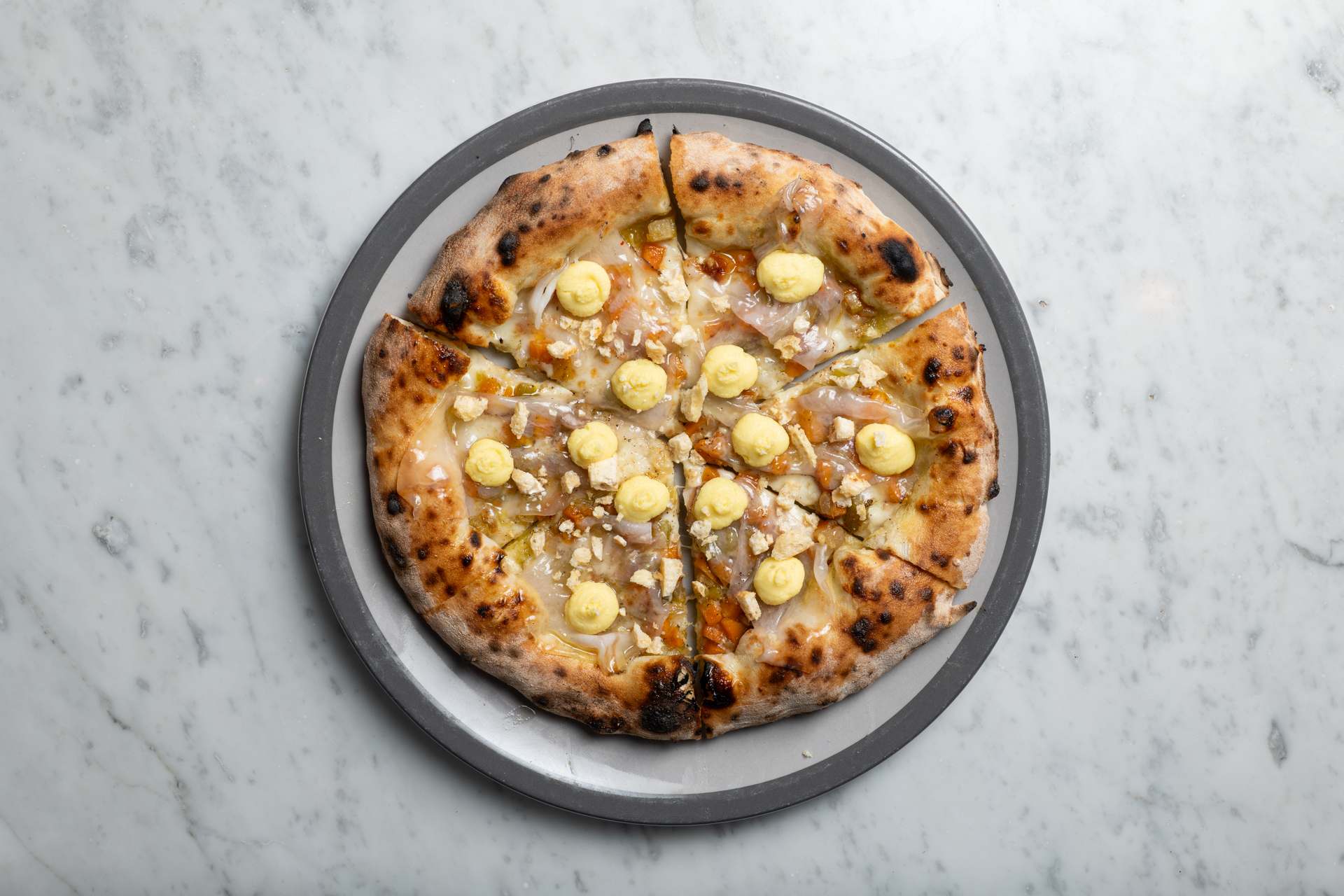 Fiordilatte, scamorza, pancetta, cipolle di Alife, origano, olio EVO